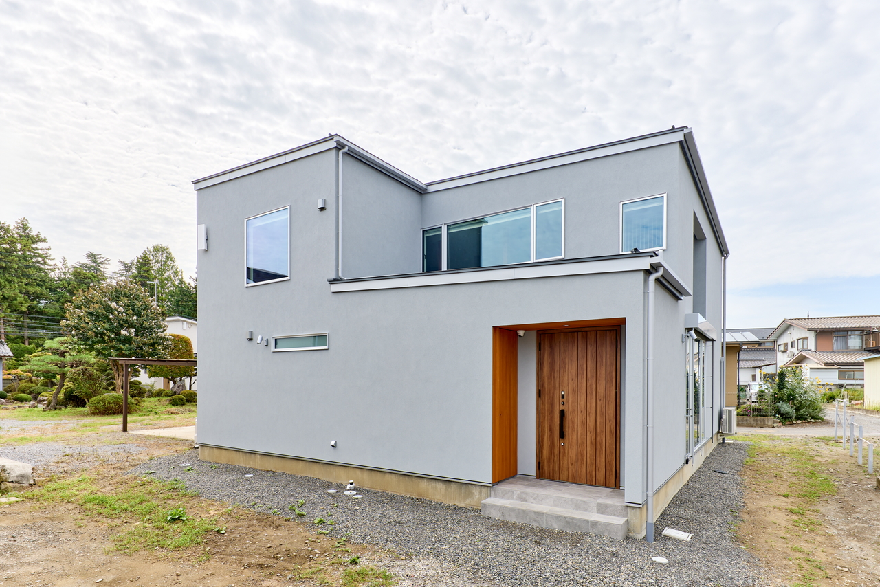 落ち着いた塗壁と大きな窓のお家